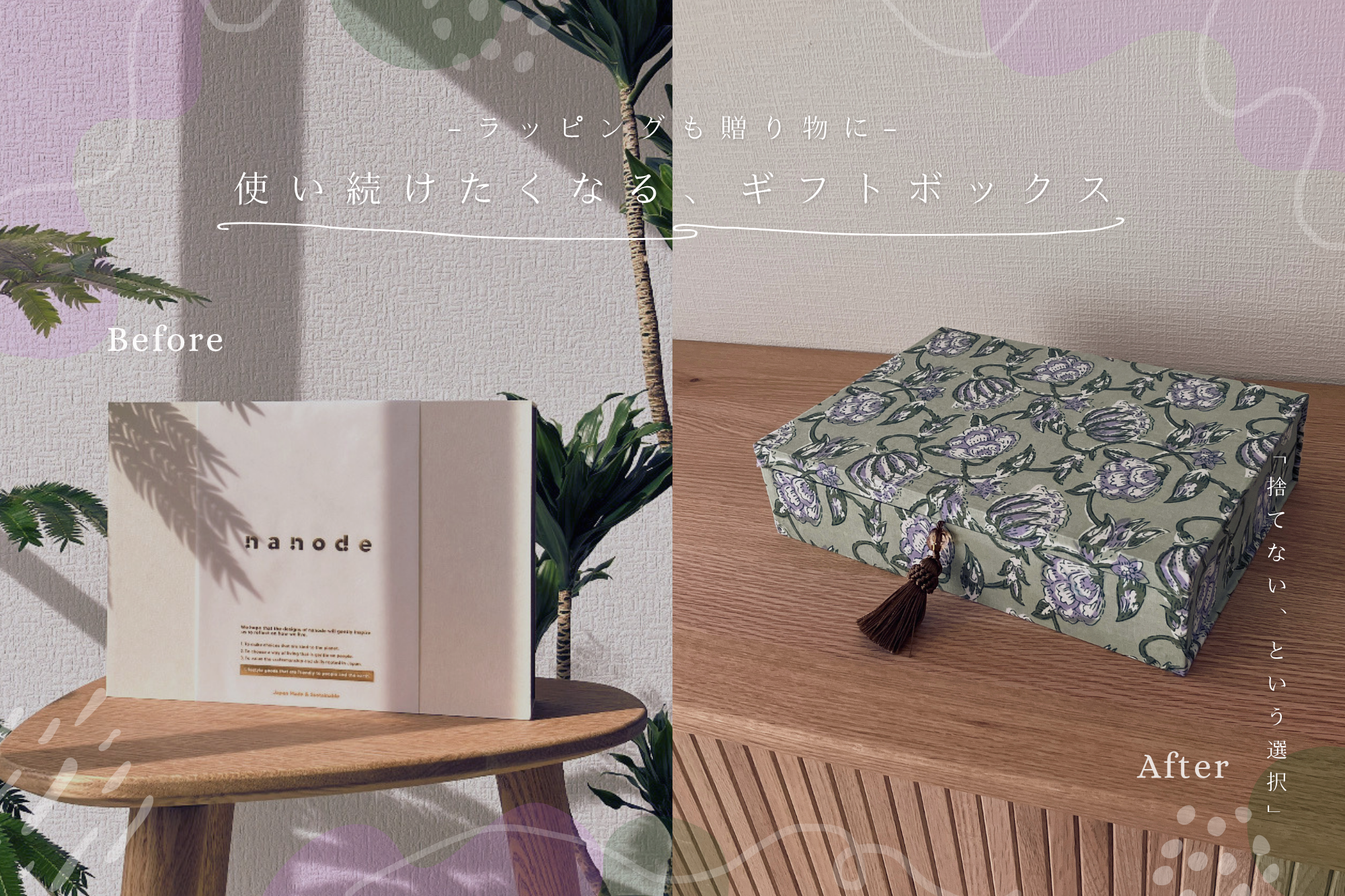 再生紙100%なのに、まるで木箱のような高級感が魅力のnanodeのギフトボックス。ちょっとした工夫で、インテリアにもなる特別な小物入れに大変身できるんです♪